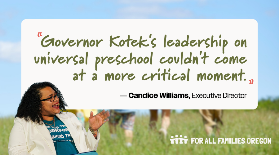 For All Families Oregon (FAFO) is excited to share that our Executive Director, Candice Williams, will be a part of the Governor’s Early Childhood Care and Learning System Roundtable effort led by co-chairs Kali Thorne Ladd and Sara Mickelson. Read the full announcement from the Governor’s office below.